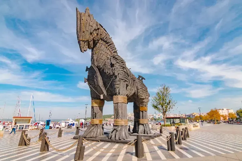 At Troy’s entrance stands a 12.5-meter wooden replica of the Trojan Horse, built in 1975 from Kaz Mountain pine. Visitors can climb inside for panoramic views of the site, which holds 4,000 years of settlement layers. Highlights include city walls, temples, megaron houses, and an Odeon. Another replica, from the 2004 film Troy, is displayed on Çanakkale’s waterfront.