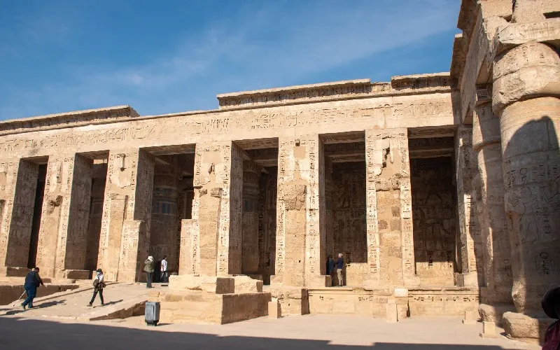 Medinet Habu is notable for its massive fortified enclosure wall and distinctive eastern entrance known as the pavilion gate. The complex includes a large mortuary temple, smaller temples, and chapels. Its well-preserved state allows visitors to see original paintings and architectural details that have been lost in many other ancient Egyptian sites.