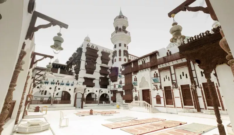 Carved doors and windows boost the building's visual charm effortlessly. The courtyard features traditional Jeddah-style windows called Rawasheen - projecting covered balconies with intricate wood carvings. Beautiful fountains and palm trees create a peacful atmosphere throughout the space and for your tour to Saudi Arabia.